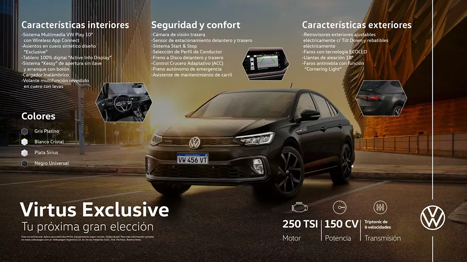 Con la pantalla táctil de 10”, VW Play es la plataforma que te garantiza el entretenimiento en tu Virtus. Integralo con tu smartphone, descargá aplicaciones con funciones seguras mientras conducís y tené la principal información de tu vehículo a mano. -